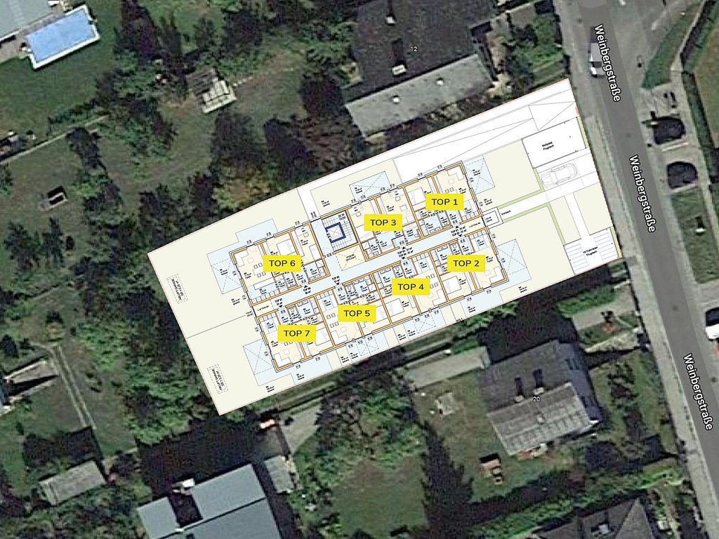 Die Kleinwohnungsanlage liegt im verkehrsruhigen Grüngürtel der Stadt Mautern in der Weinbergstraße 14 und trotzdem nur 5 Gehminuten von den reichhaltigen Einkaufsmöglichkeiten, Ärzten und Bildungseinrichtungen im Stadtzentrum entfernt. Das ebene, ideal süd-westlich ausgerichtete Grundstück ermöglicht in den Wohnungen helle und sonnige Wohnräume und Außenflächen. Die Wohnhausanlage wird durch stufenlose Zugangswege von der ostseitig gelegenen Weinbergstraße erschlossen.