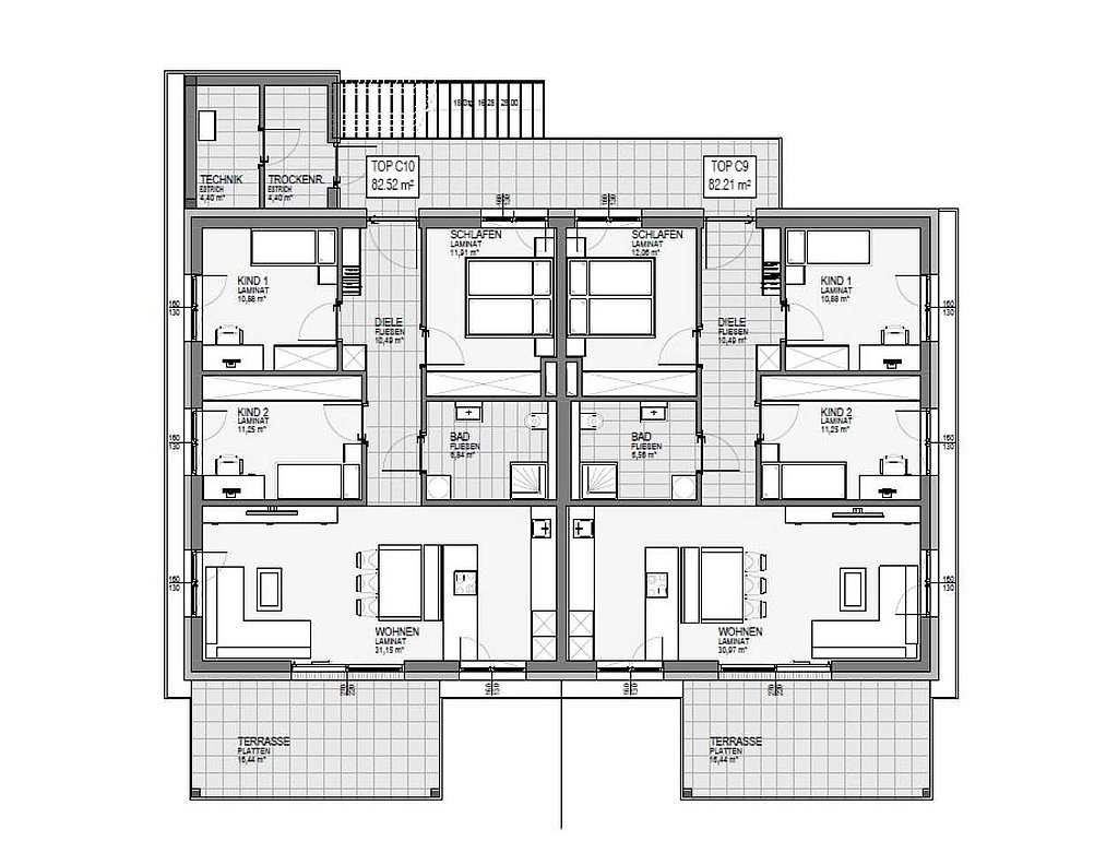 Gemütliche Sommerabende lassen sich auf den überdachten Terrassen der Erdgeschoß-Wohnungen erleben, die dazugehörigen Eigengärten vergrößern zusätzlich den Lebensraum und bieten Platz für Hobby und Freizeitvergnügen aller Art. Die großzügigen Balkone (5,90 x 2,80 m) im Obergeschoß erweitern den Wohnraum nach außen hin.